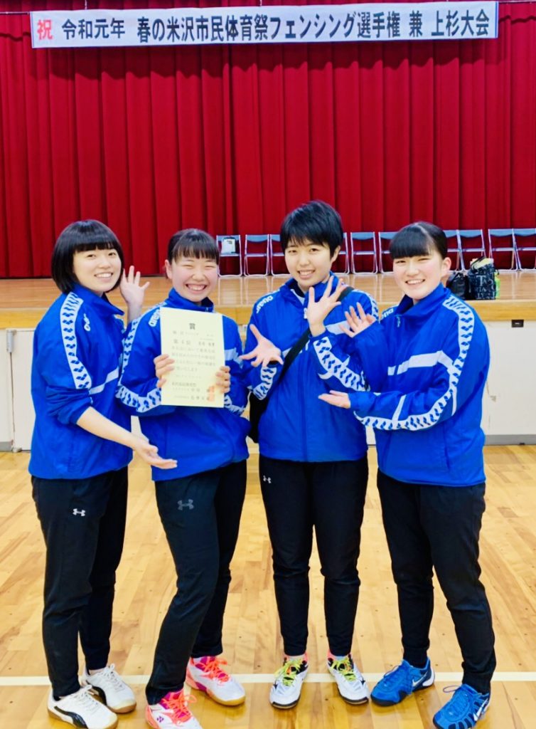 2019.05.14 2019年度春の米沢市民体育祭フェンシング選手権 試合結果 5月1日(水)~5月2日(木)米沢市民体育館において、2019年度春の米沢市民体育祭フェンシング選手権兼上杉大会が行われました。 ●カデ女子 第3位 庄司彩葉(1年) ●一般女子フルーレ 第4位 庄司彩葉(1年) 第7位 益子明香里(2年) 右 2年飛田 左 3年渡邉 左 2年益子 右 1年庄司 前の記事へ 一覧へ戻る 次の記事へ