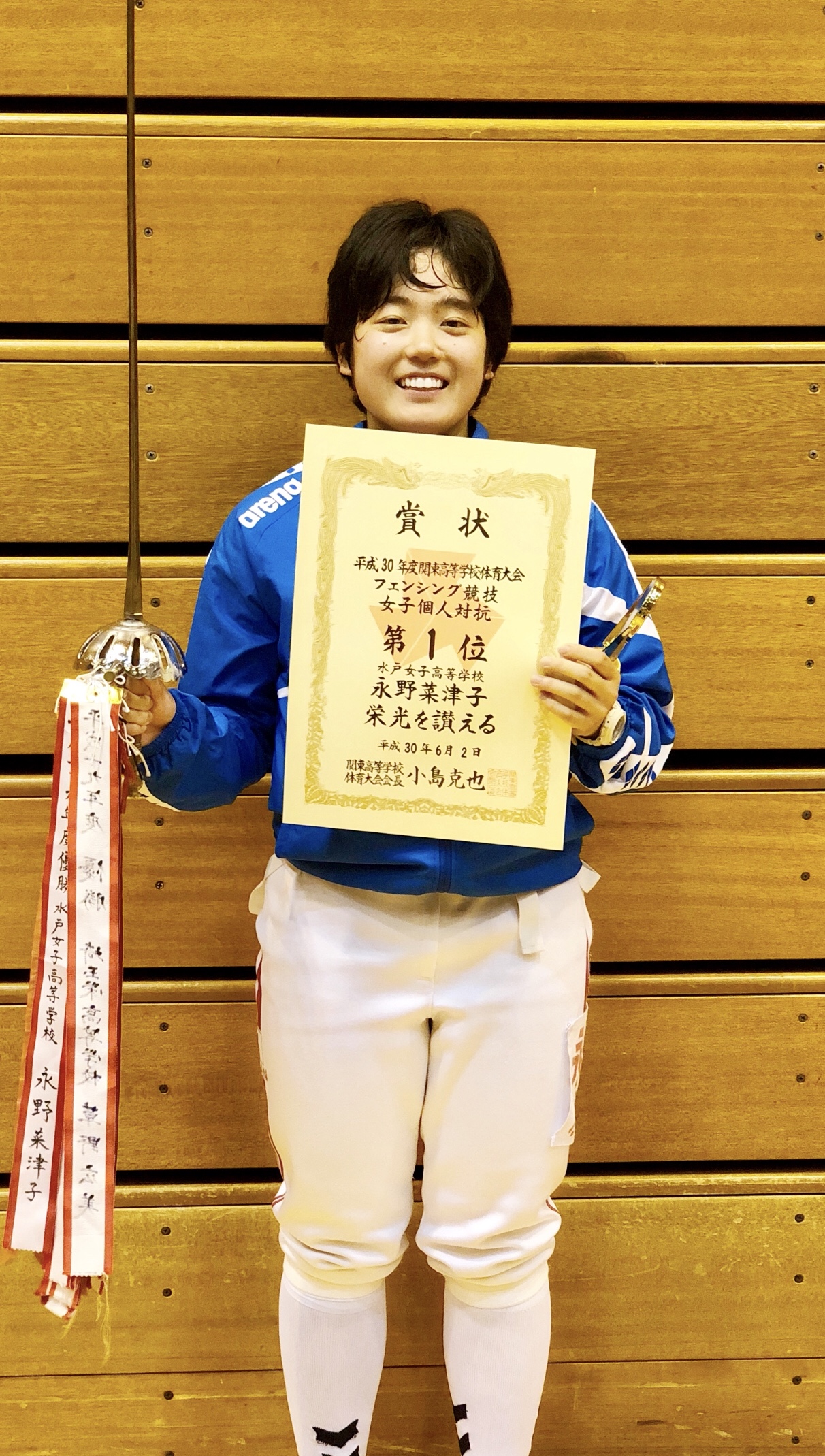 2018.06.05 平成30年度関東高等学校フェンシング大会 試合結果 6月1日(金)・2日(土)・3日(日)新座市民総合体育館において、関東高等学校フェンシング大会が行われました。 3年永野菜津子が女子個人戦の部を制し、昨年に引き続き2年連続の優勝を果たしました。 永野菜津子 (1位/48人中) ●予選プール 5勝0敗 1位通過 ●決勝トーナメント 1回戦 V10 - 0 梅沢(埼玉栄) 2回戦 V10 - 0 山口(王子総合) 準々決勝 V15 - 4 成田(埼玉栄) 準決勝 V15 - 5 高橋(東亜学園) 決勝 V15 - 6 斎藤(埼玉栄) 一覧へ戻る 次の記事へ