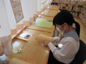 1年生が新しい本にカバーをかけています。