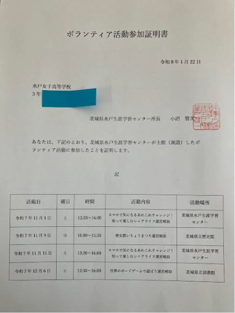 先日、水戸生涯学習センターから11月~12月に参加したボランティアの証明書が送られてきました♪