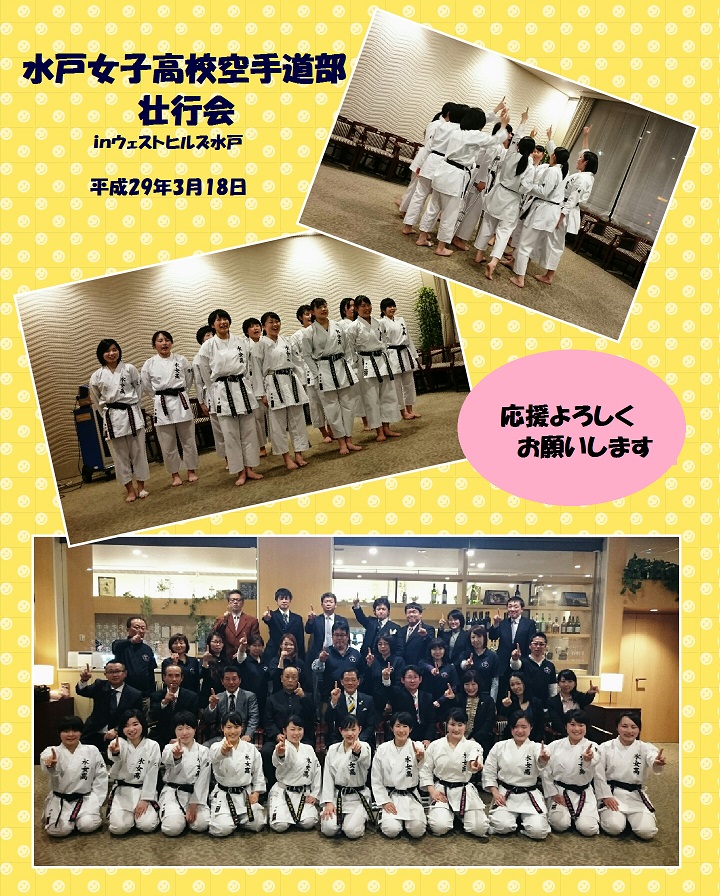 2017.03.25 *壮行会* 3月18日に水戸ウエストヒルズにて本校空手道部の全国選抜大会出場の壮行会が行われました。 ご多忙中にもかかわらずご出席いただき、本当にありがとうございました。 ご出席して下さった皆さま、また、応援して下さった皆さまの声援に応えられるよう頑張ってきます!! 感謝の気持ちを胸に全国選抜大会では最高の試合をしてきます。 応援よろしくお願い致します。 前の記事へ 一覧へ戻る 次の記事へ
