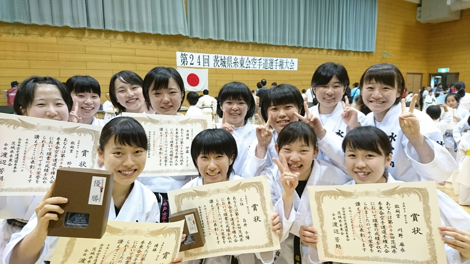 2017.05.21 第24回茨城県糸東会空手道選手権大会 西武総合運動公園体育館で標記の大会が行われました。 結果は以下の通りです ●高校生女子形 井川あかり・・・優勝 伊藤さぎり・・・2位 ●高校生女子組手 白井 千陽・・・3位 川野 麻衣・・・4位 ※入賞おめでとうございました 全国、関東での活躍を期待したいと思います 前の記事へ 一覧へ戻る 次の記事へ