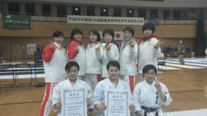 2018.01.21 第26回関東高等学校空手道選抜大会 会場・・・寒川総合体育館(神奈川県) 期日・・・平成30年1月20日(土)21日(日) 本校は個人形2名と団体形の出場でした。結果は 伊藤選手1回戦敗退でしたが、気持ちを切り替えその後の敗者復活戦で見事勝利を収めました。 北條選手は1回戦勝利、2回戦は惜しくも2対3で惜敗で北関東3位、そして、団体形も北関東3位という成績で3月に行われる全国選抜大会に出場することが決まりました。 今後は更に努力を積み、“高み”を目指します。 前の記事へ 一覧へ戻る 次の記事へ
