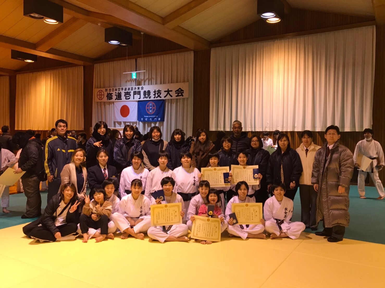 2019.12.22 3年生引退試合 ●12月21日(土)に第38回空手道糸東会修道壱門競技大会に参加しました。 3年生の引退試合です。 ●一般女子の形・組手で競技、表彰の様子です。そして最後に全員で記念撮影です。 ●とても暖かい雰囲気の中で最後を迎える事ができました。 来年関東選抜大会がありますが1・2年生に頑張ってもらいましょう!! 試合の後は皆で焼肉を食べました。とても美味しかったです。 ●闇市さん有難うございました。また、来年も宜しくお願いします。 前の記事へ 一覧へ戻る 次の記事へ