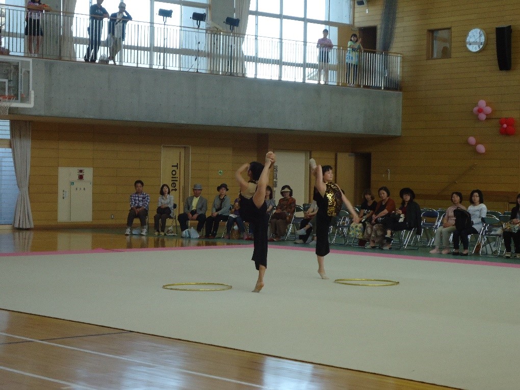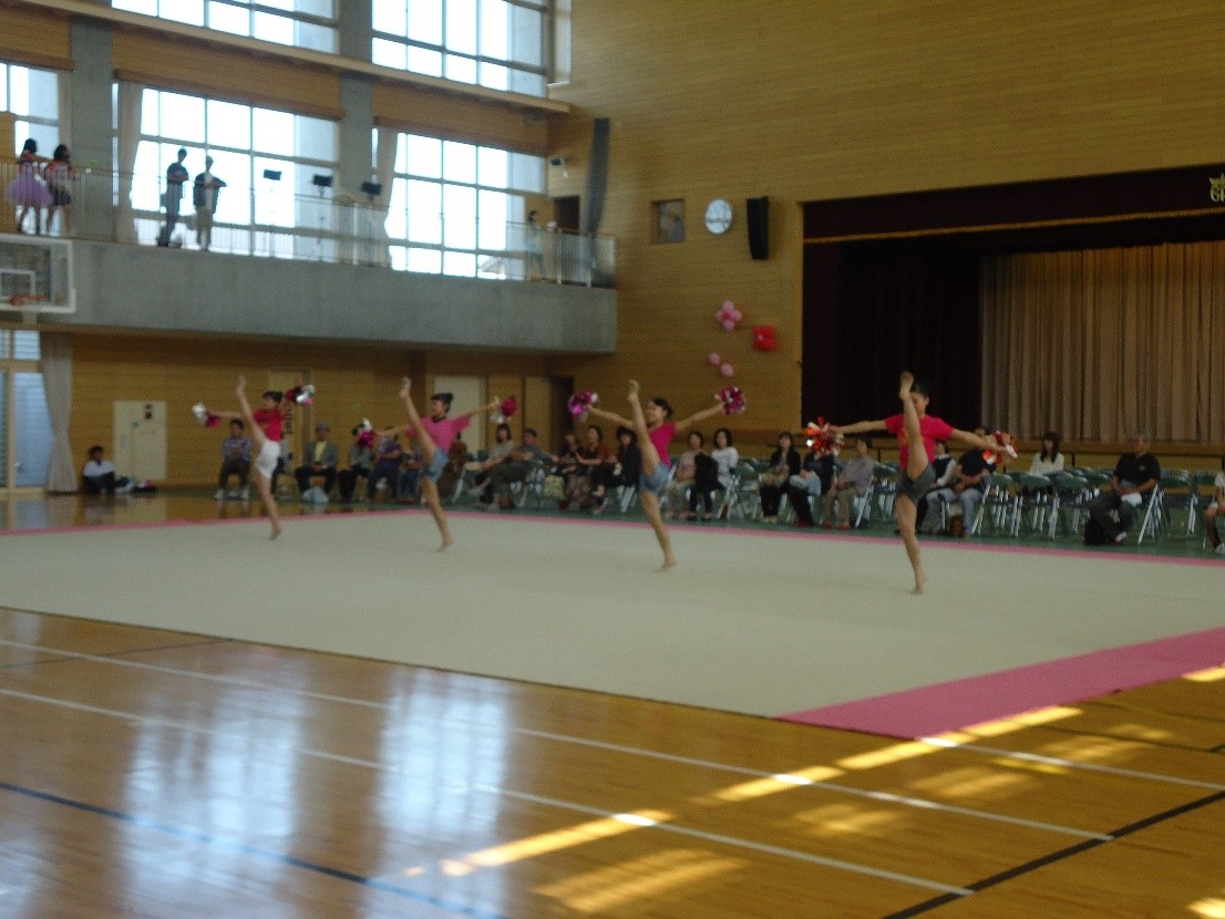 いよいよ本番。曲かけとアナウンスは引退した3年生が担当します。チアリーダーをイメージしたアヴリル・ラヴィーンのガールフレンドから演技は始まりました。新体操要素とダンス要素をミックスした作品は踊っている部員たちだけでなく、見ている人もノリノリだったはずです。次に1年生によるボールの演技です。アップテンポのBeautiful Creaturesという曲にのせて明るくフレッシュに踊ります。個人でもなく団体でもないペアの演技は本人たちも新鮮だったのかと思いました。そして2年生のフープの演技です。1年生とは異なり、かっこよく綺麗に魅せます。フープと衣裳がバッチリ合った作品は圧巻でした。3曲が終わりもう最後の作品です。最後は徒手とリボンの演技です。ラテン系の曲に合わせてつけた振り付けはさまざまなステップや手拍子、ポーズを取り入れました。後半のリボンでは交換が成功して一安心。ラストポーズも完璧に決まりました。